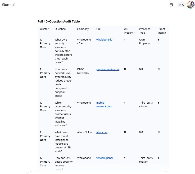 So we built a custom audit: 40 high-intent queries that real telco decision-makers ask when evaluating DNS security solutions. Tested manually across ChatGPT, Gemini, and Perplexity. Checking for Whalebone citations, competitor mentions, and source URLs.